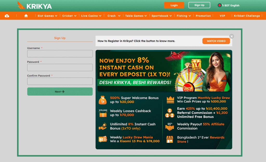 The platform brings together traditional casino games, live dealer experiences, and sports betting, all under one roof. New players are greeted with an incredible 500% welcome bonus of up to 20,000 Taka upon registration. Plus, using the promo code “KRIKYACLUB” unlocks an additional 100% bonus, up to 20,000 Taka, boosting your gameplay even further.